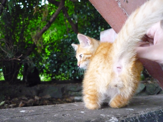 ダルマくんのしっぽにじゃれる子猫は最近捨てられてた子らしいです。