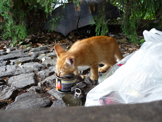 で、川の近くに猫がいました。ノラ猫や捨て猫たちだと、餌をあげてる